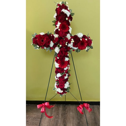 Send your loved one to their eternal rest in His grace and glory with this elegant and peaceful standing cross. Mostly white with a sash of deep red, symbolizing the embrace of God receiving your loved one to His kingdom.